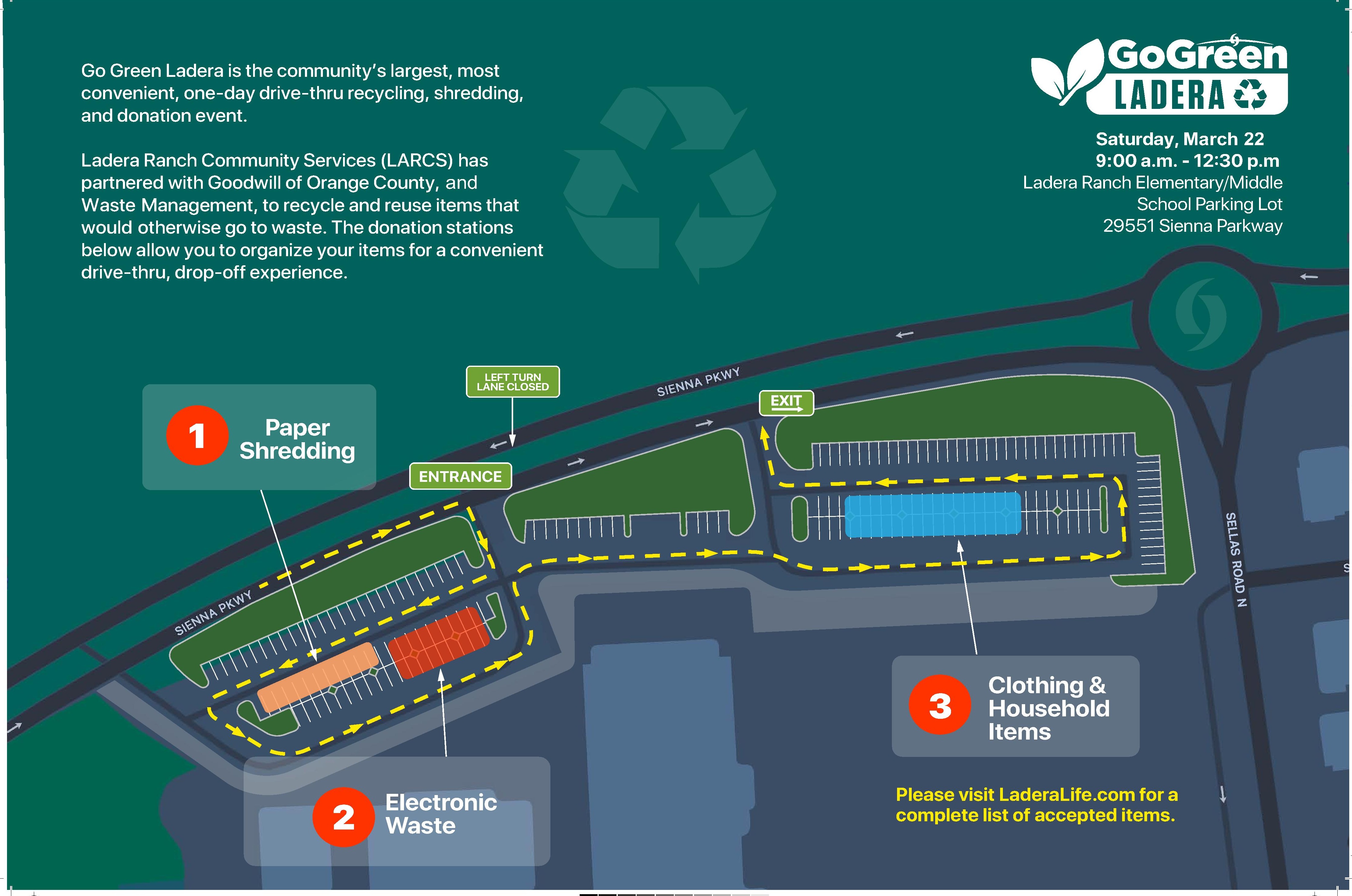 Go Green Ladera is the communityʼs largest, most convenient, one-day drive-thru recycling, shredding, and donation event. Ladera Ranch Community Services (LARCS) has partnered with Goodwill of Orange County to recycle and reuse items that would otherwise go to waste.